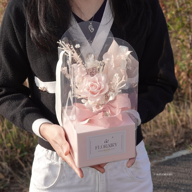 Each arrangement features a preserved rose paired with complementary foliage, thoughtfully styled in a randomly selected glass bud vase. (The vase style may vary and cannot be chosen.) Every piece comes with a portable flower box, perfect for gifting or taking with you on the go. A lovely gesture for any occasion!