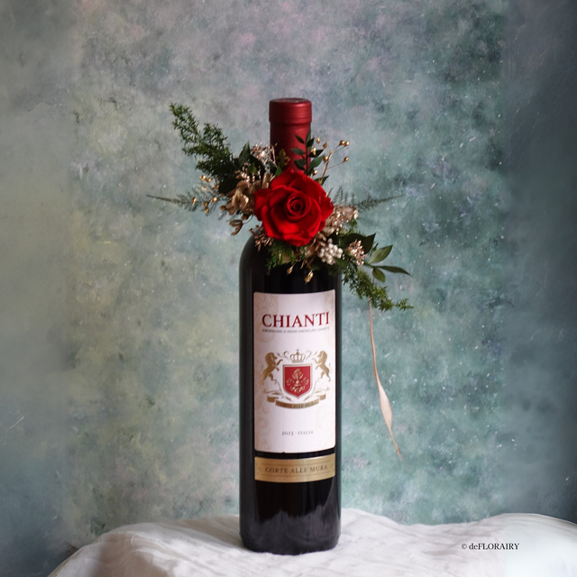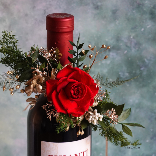 A flower arrangement for wine bottles featuring preserved red roses with golden and green foliage, bringing elegance to festive tables. Perfect for holiday celebrations like Christmas and other special occasions.
