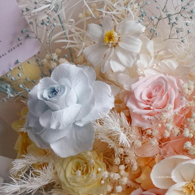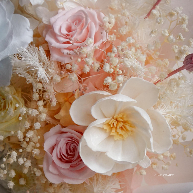 2. To enrich the design and texture, some arrangements may include premium Sola wood flowers, a natural handcrafted material often used alongside preserved blooms for a fuller look.